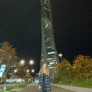 First, we went to the Turning Tower, the first spiral skyscraper in the world. It was really cool to see, but if you're taking pictures, you have to be careful not to get crushed by a bike. Then, before going on it, we went to see the bridge that connects Sweden, specifically Malmö, and Denmark, specifically Copenhagen. It's the longest bridge in the world with train tracks on it, and even though there aren't as many lights now because of the energy crisis, it was still very cool to see.